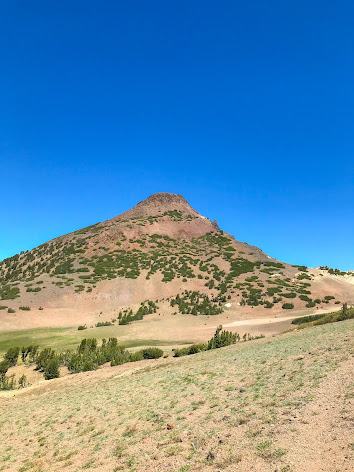 The route up to Stanislaus was an attempt to not lose elevation, so we tried to go due west, but some stubborn, giant chunks of rock would not permit this, and there was indeed some elevation loss and regain. As we started to go up, the only other consideration was to go around the stands of small pine trees, and by that method, our path came to be. Ghosts of use trails came and went, but it was mainly "choose your own adventure" over or around the worst sections of talus and shattered volcanic rock on the steep slope. Reports considered this peak to be a class 2 climb, so maybe there is an easier way to go that we simply didn't find, because our path to the top was decidedly class 3. More fun that way! We took turns going up to the top. I went up first, while Axell stayed below the class 3 section with the dog. The route of ascent was a short, but memorable climb through a jagged landscape, and I guess what you would call a brief chute. Up over the rim, and I was on the flat top, like a pile of broken terra cotta tiles. I found the summit register, and expected 360 degree views, not staying too long, time was on my mind. Then I went down, stayed with the dog while Axell went up to claim his first 11er.